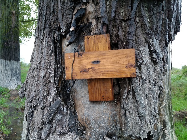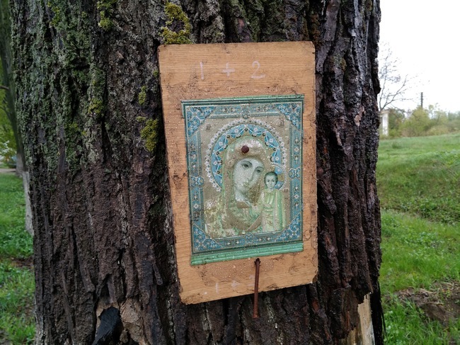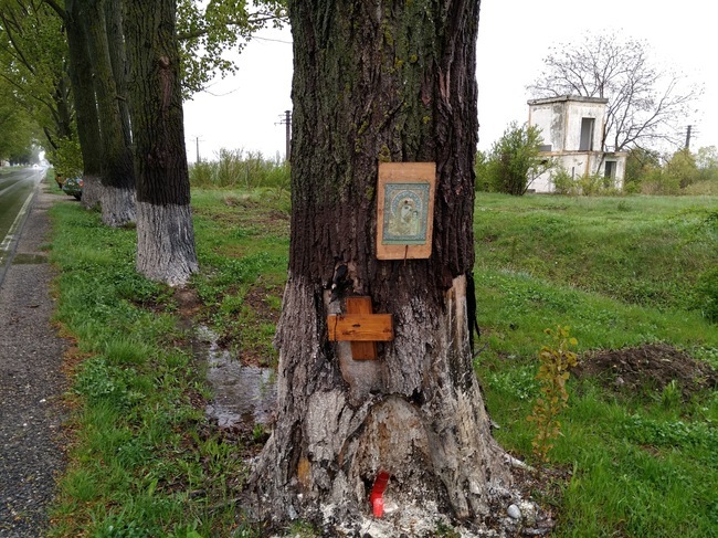Deasupra și dedesubtul icoanei stă scris 1+2, iar lângă ea este o cruce improvizată, formată din două bucăți de scândură bătută de trunchiul copacului cu cuie groase. La baza pomului se află două lumănări care par aduse cu ceva vreme în urmă.