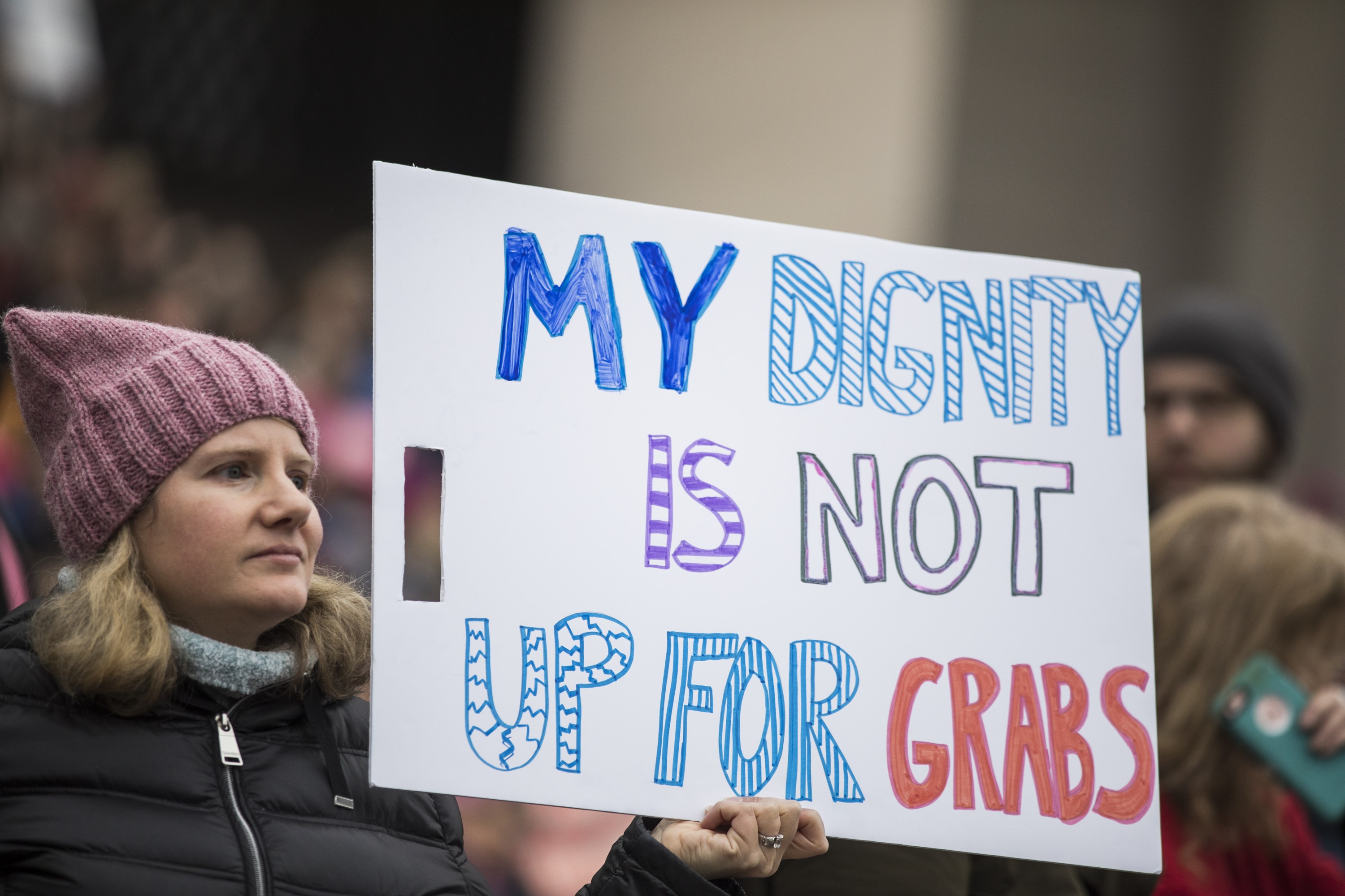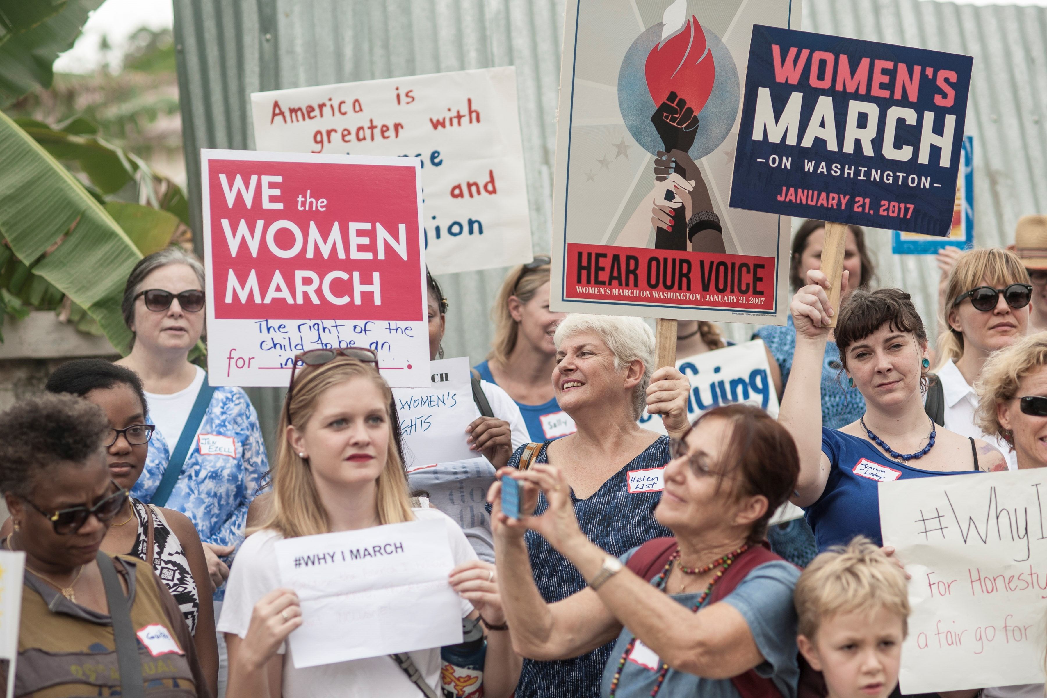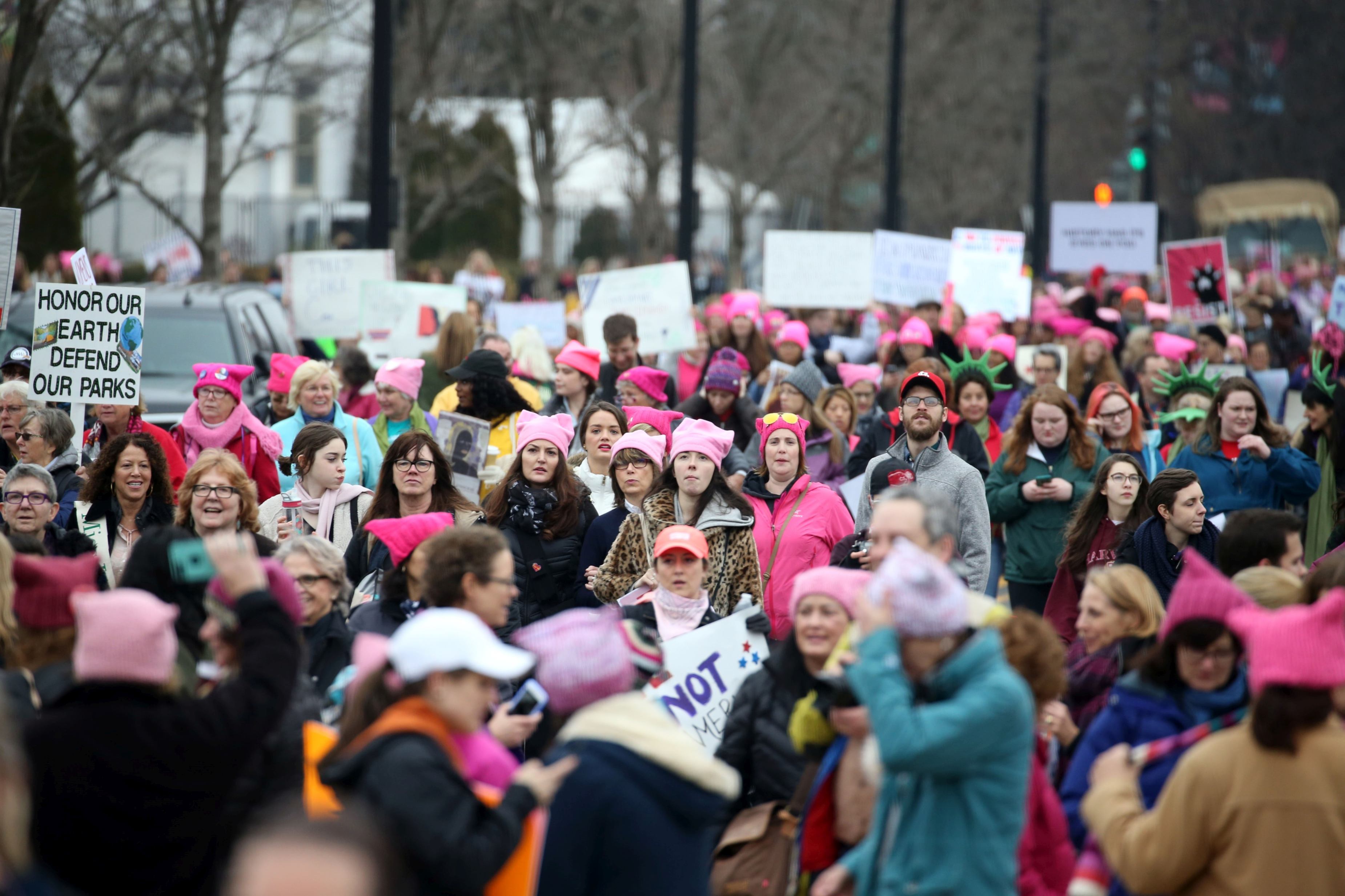 Alicia Keys a urcat pe scenă şi a cântat „This girl is on fire”, schimbând versurile în „This girls are on fire”, în faţa unui public plin de căciuli roz în semn de protest. Ea a recitat versuri din poemul „Still I Rise”, de Maya Angelou. Mulți dintre manifestanți purtau pălării roz cu urechi de pisică („pussy hats”), devenite simbolul opoziției față de Trump.