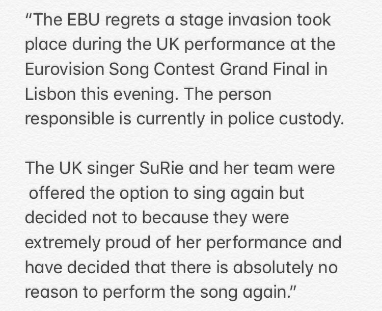 UPDATE, 23:37 O persoană a perturbat momentul lui Surie, fapt pentru care artista a cântat emoționată. Persoana a fost scoasă din sală, conform EBU. Acum se află în custodia poliției.