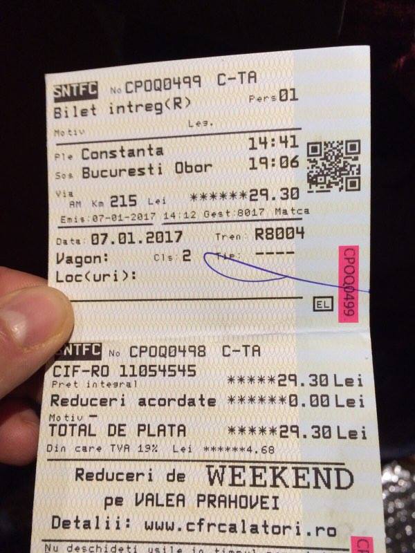 „În jurul orei 14.41 a plecat un tren din Constanța către București (Regio 8004). La ora 17 mai era un tren Interregio. Când am luat biletul, doamnele de la ghișeu mi-au spus că trenul de la 14 e singurul care pleacă și că nu știu dacă cel interregio va pleca.
