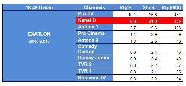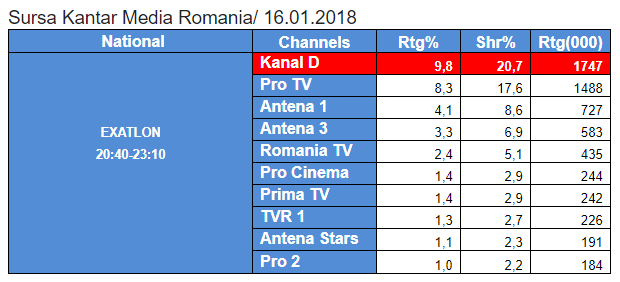 Comercialul a fost extrem de bine reprezentat in top de Kanal D, reality-ul plasand statia pe locul doi, cu 8,0% Rating si 21,0% cota de piata, la distanta considerabila de urmatorul clasat.