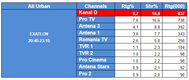 „Exatlon” a fost prima optiune a telespectatorilor la nivelul publicului National, statia inregistrand 9,8% Rating si 20,7% cota de piata, conform datelor oferite de Kantar Media Romania. Si pe All Urban „Exatlon” s-a clasat tot pe primul loc, cu 8,7% Share si 18,8% cota de piata.